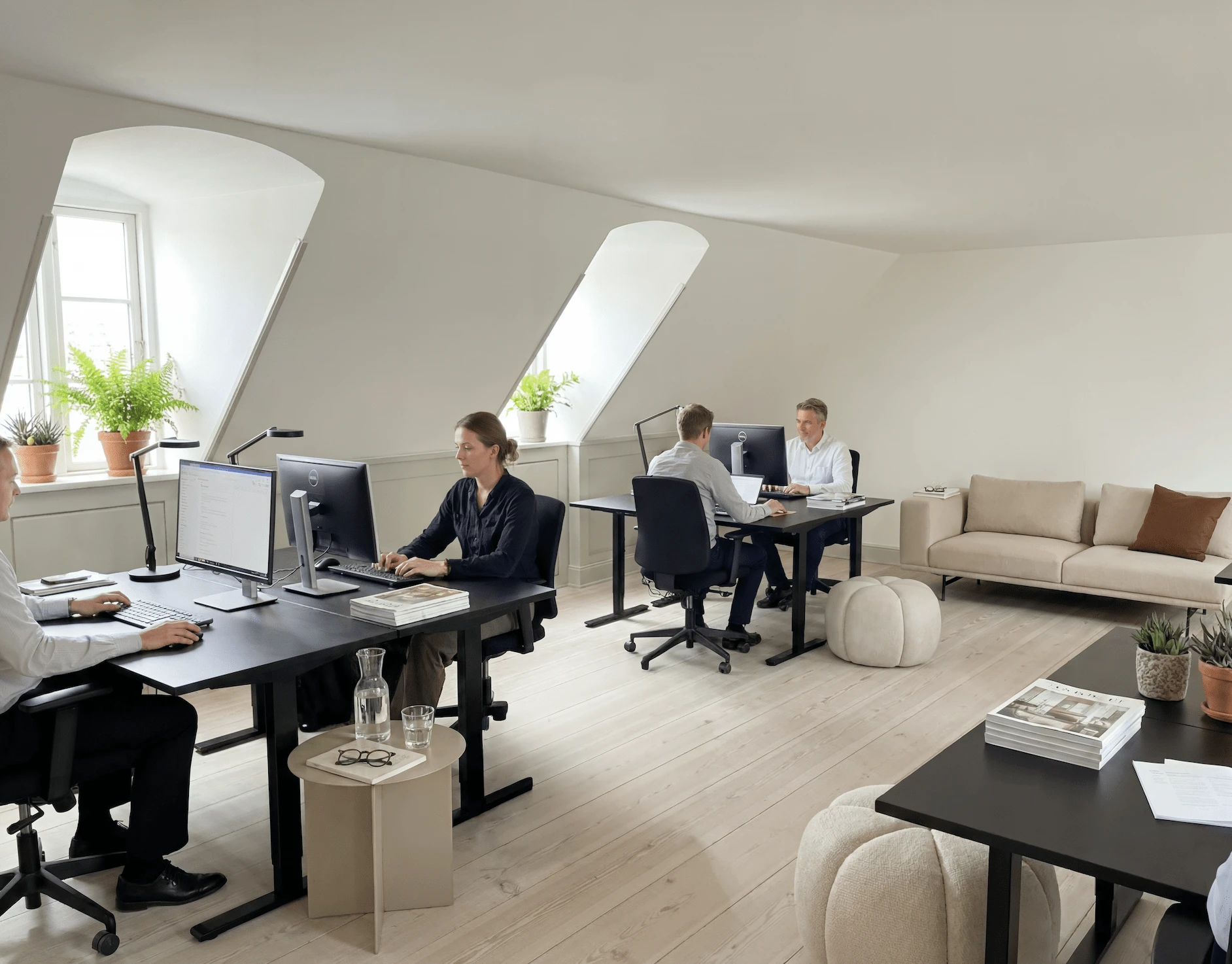 Kontor med skrå vægge på anden sal