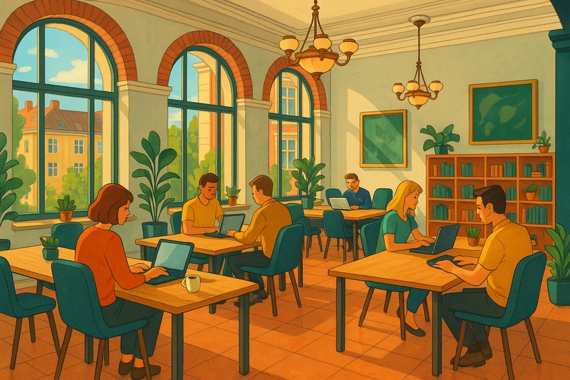 De åbne hverdagstimer kl. 8-18 giver fleksibel arbejdsro, mens caféområdet og gårdhaven inviterer til sociale pauser efter behov.